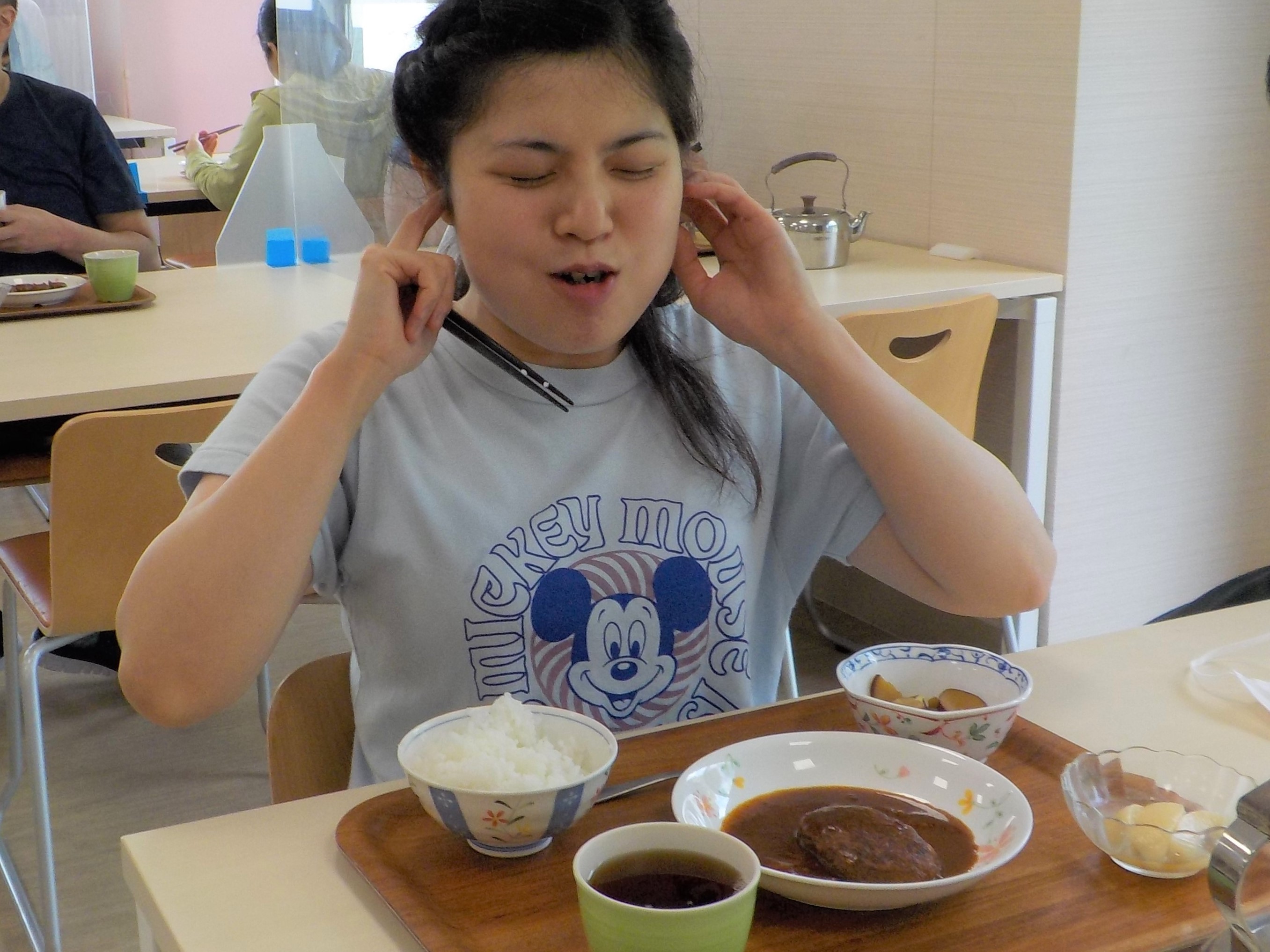 お昼には栄養士の職員から非常食についてのお話がありました。施設で保管している非常食は何日分か。どこに保管をしているか。など質問を交えて非常食の必要性についてお話をしました。皆さん積極的にお話を聞き、その後アルファ米、ハンバーグ、サツマイモのレモン煮、桃缶といった非常食を食べました。